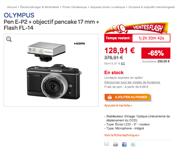 La carte bancaire de la majeur partie des photographe a chauffé ce week end 🙂 Et oui, par l’intermédiaire de Valmente et de Phototrend, une super promo Carrefour a été mise en avant : celle de l’Olympus E-P2. En fin de vie, et remplacé par son petit frère le P3, cet hybride était annoncé au prix de 128€91 avec un 17mm et un petit accessoire photo : le flash. Très interessant 🙂 surtout quand on a envie de tester un peu cette gamme d’appareil photo, mais qu’on trouve des appareils comme le Nikon J1 un peu trop cher… Par ailleurs, Carrefour propose cet appareil lors d’une vente flash, avec 65% de réduction. Certes le prix est bas, cependant, 65% de réduction pour une vente flash, cela n’a rien de choquant 🙂